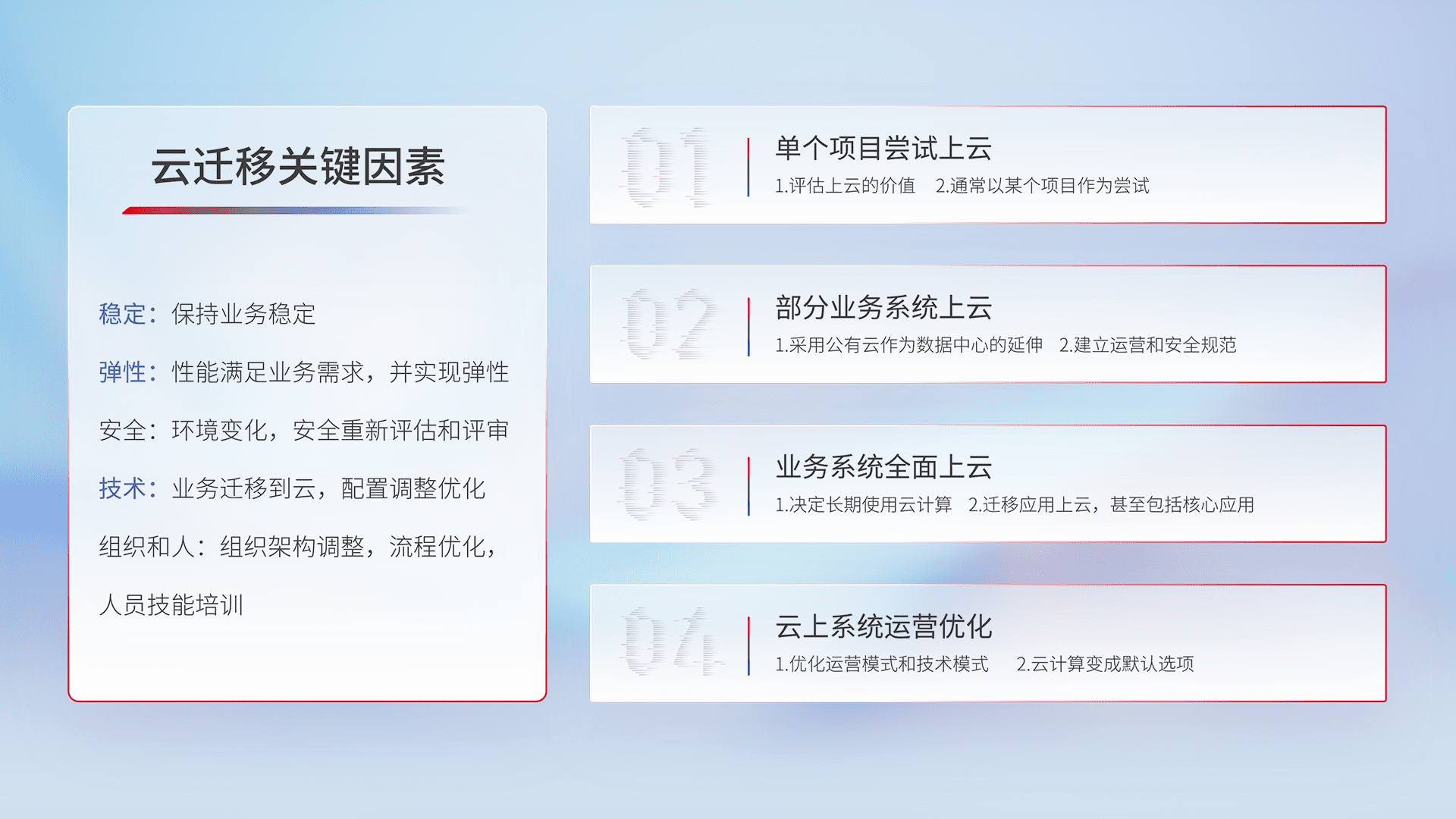 结合实际业务,,从规划设计、、、、云平台选型、、、云原生改造、、数据迁移、、、、集成交付,,迁移全过程为客户识别最佳上云路径,,,做好风险识别管理,,设计网络架构、、、身份权限、、、安全审计合规、、、操作审计、、、日志审计、、、监控告警策略、、、、多站点容灾设计等,,,对云上基础设施进行整体规划,,,,提升IT治理水平,,,以满足弹性、、、、高可用、、、、高性能的需求。。。