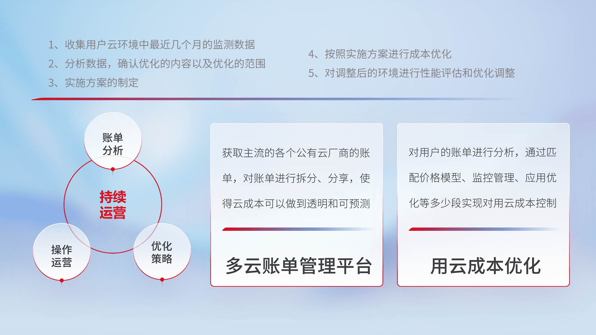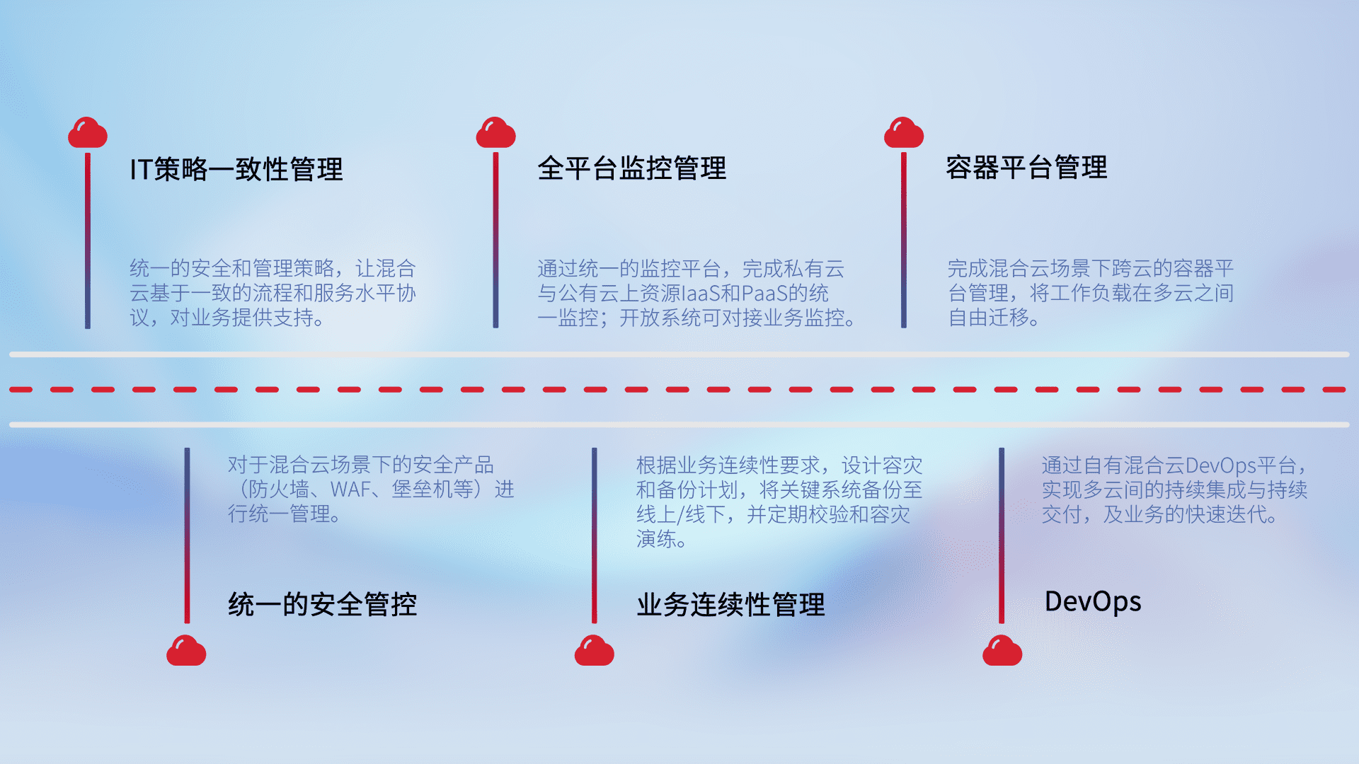 通过多云纳管,,以统一的资源数据模型把客户的云资源进行抽象和封装,,,进而实现对多云资源的统一操作,,保障云资源管理的可靠性、、、稳定性与可用性。。。。量身定制化运维内容,,,,配置、、、开发运维、、、补丁管理、、、、备份、、监控、、、、认证和访问管理、、、、审计和日常巡检等,,,保障在用云过程中的可靠度,,,稳定度以及高可用率。。。。