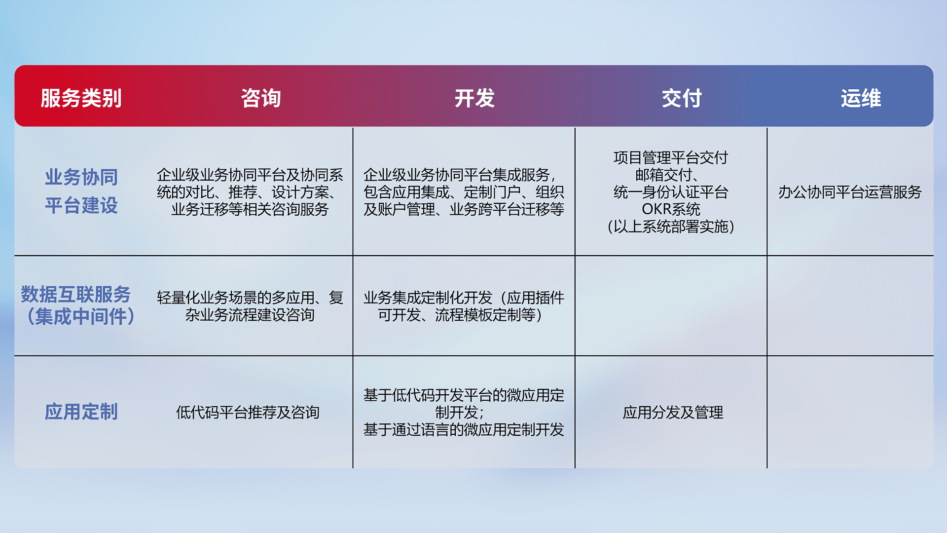 针对钉钉、、、企微、、IDaas等平台级产品提供产品的规划、、方案、、、交付、、、、定制化开发等服务,,实现如统一协同办公、、、智能客户服务、、混合会议管理、、、、智能数据查询、、、等业务场景,,实现数字化转型。。。。